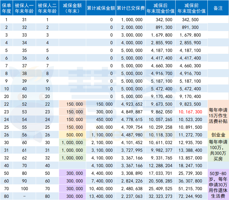 可以看到,不申請(qǐng)減保的情況下,小詹23歲,保單現(xiàn)金價(jià)值超過(guò)1000萬(wàn)。
