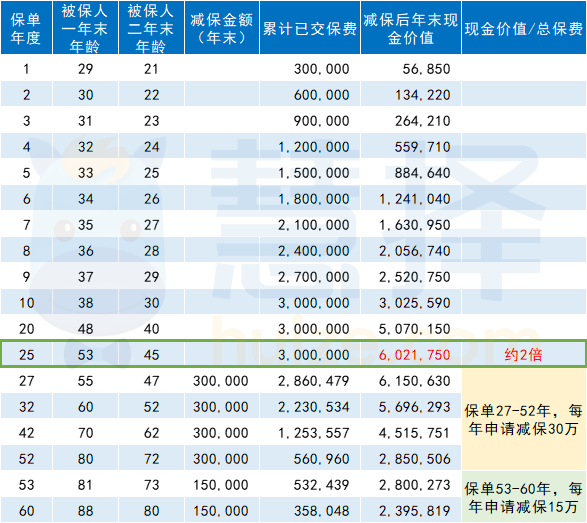??雙被保險(xiǎn)人,可以保障到最后一名被保險(xiǎn)人身故為止,從而保證現(xiàn)金價(jià)值的增長(zhǎng)時(shí)間更長(zhǎng)。