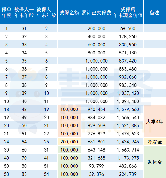 ??30歲-32歲每年減保100萬(wàn),共領(lǐng)取300萬(wàn)用于買(mǎi)房結(jié)婚。
