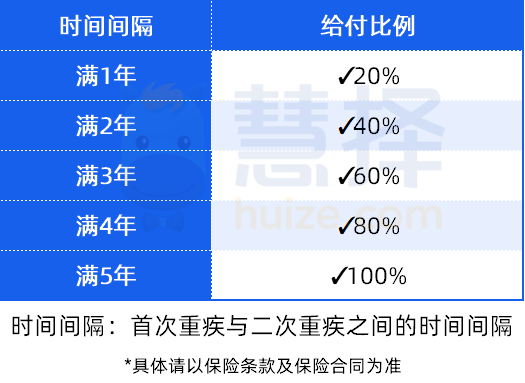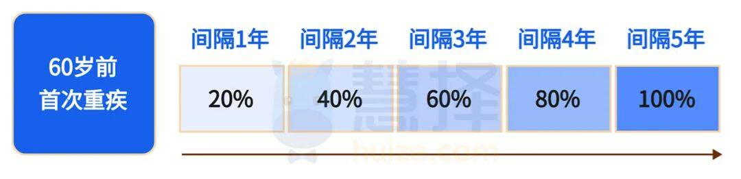 60歲前,首次重疾1年及以上,確診其他重疾,二者的間隔時間每多1年,賠付比例多20%。