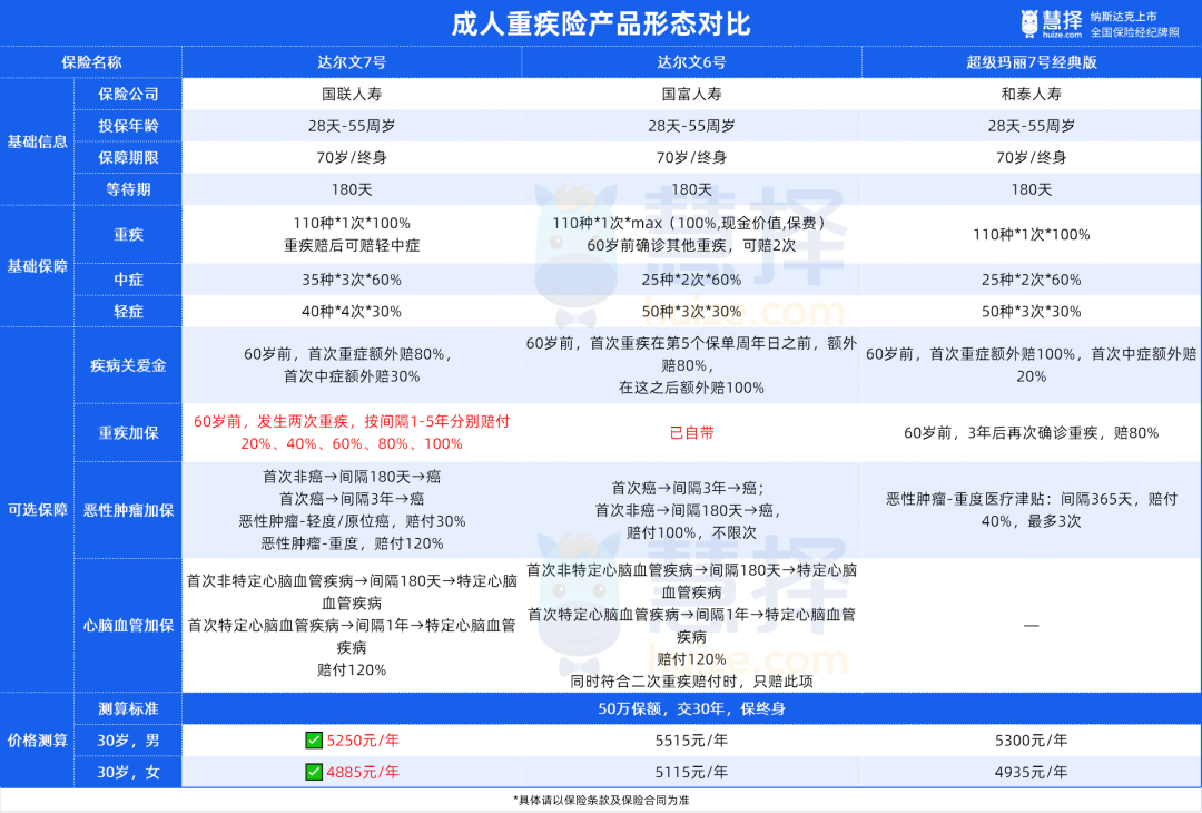 我從市面熱銷重疾險中,挑選了2款保障全面的產品跟達爾文7號進行對比。