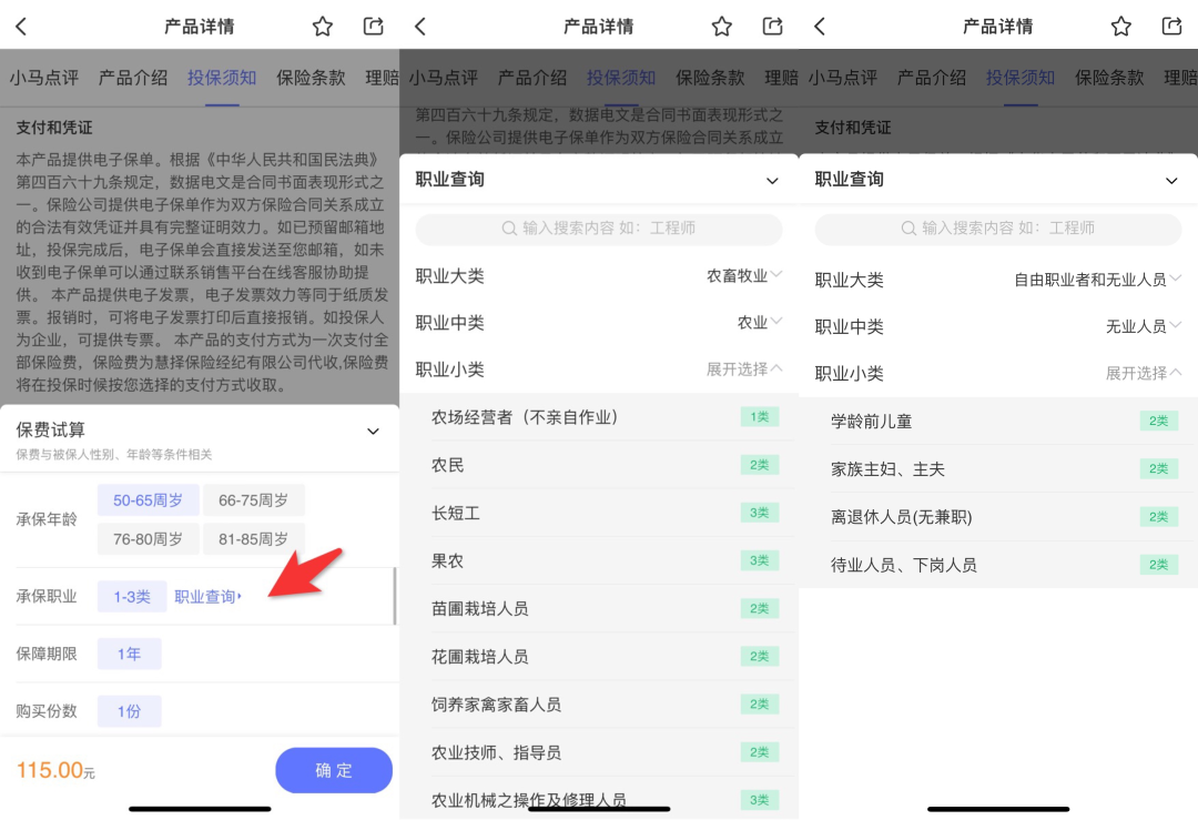 在投保的時(shí)候,有個(gè)【職業(yè)查詢】,然后輸入被保人的職業(yè)名稱,或者選擇職業(yè)類別,就能看到。