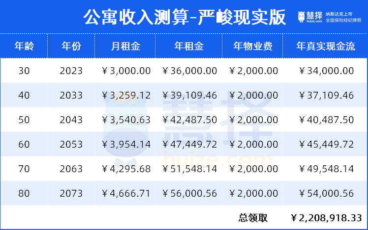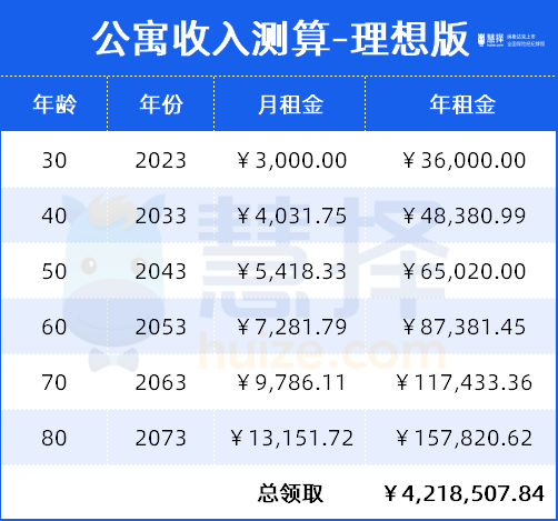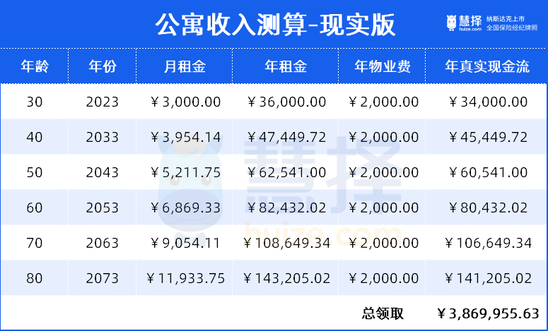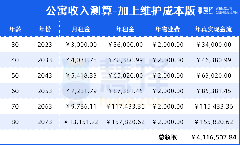 假設(shè)自己能活到80歲,租金每年按照3%的漲幅,從30歲到80歲,租金能收400+萬!