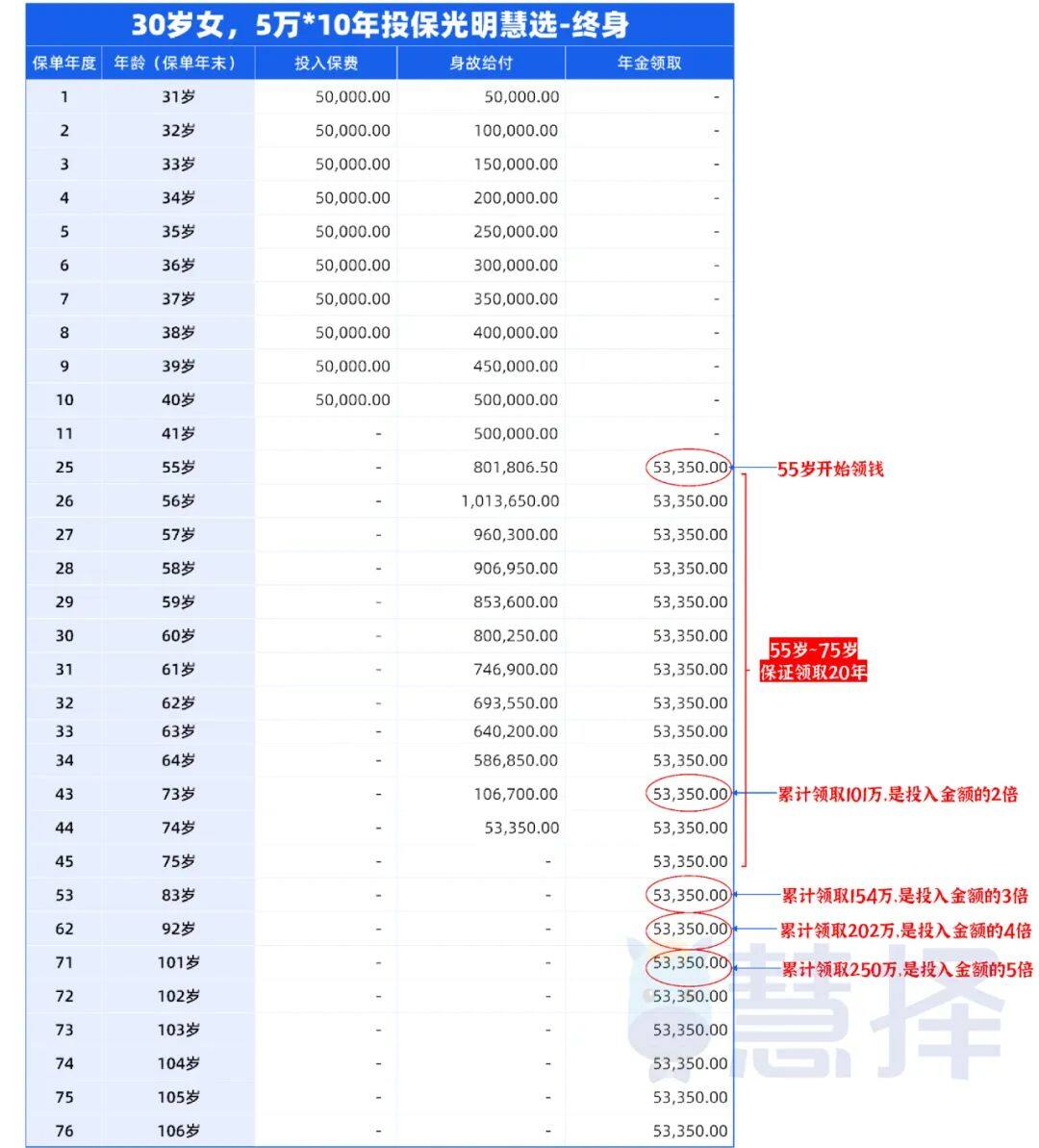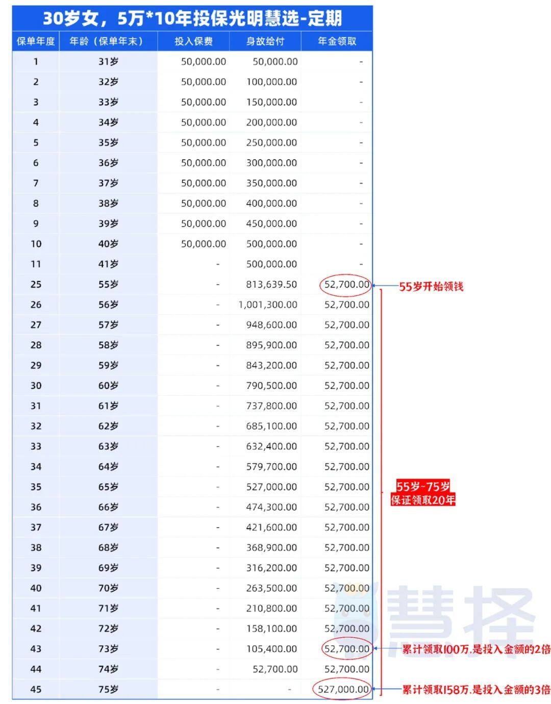 比如30歲的東北馬莉給自己買光明慧選,每年交5萬,交10年: