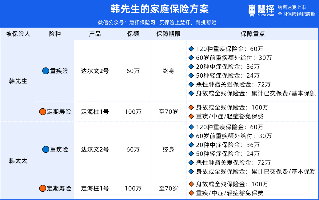 在慧擇保險咨詢顧問的建議下,韓先生給自己和愛人配置了重疾險和定期壽險。具體的方案在下方: