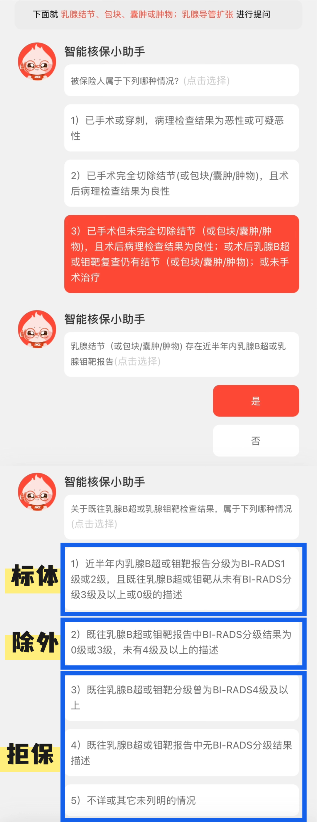 而且智能核保也很給力,乳腺結節(jié)1-2級有機會標體承保,而乳腺結節(jié)0級或3級,就有機會除外承保。