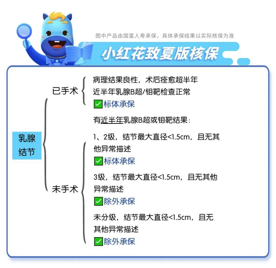 小紅花致夏版的核保還算寬松,乳腺結節(jié)1-2級,可以標體承保,乳腺結節(jié)3級可以除外承保。