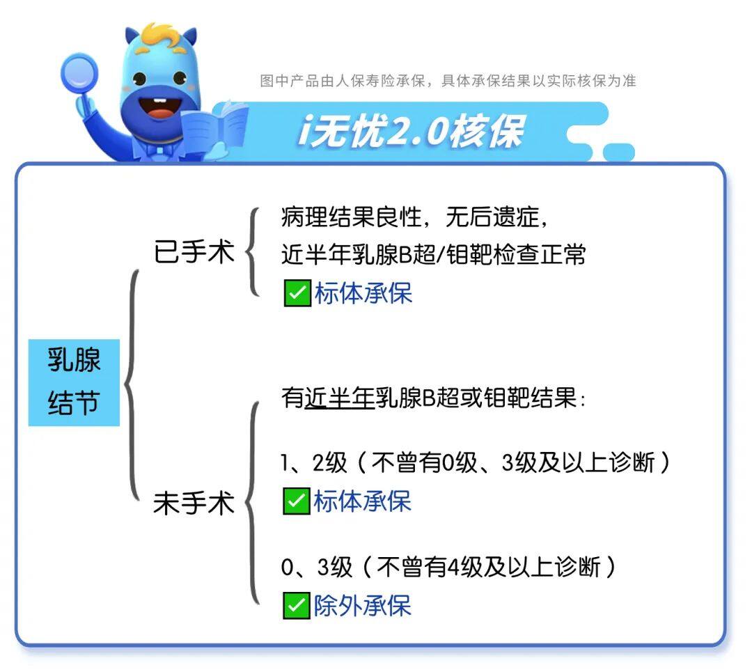 比如i無憂2.0重疾險,乳腺結節(jié)彩超1-2級可標體承保,3級或0級可除外承保,4級則直接拒保。