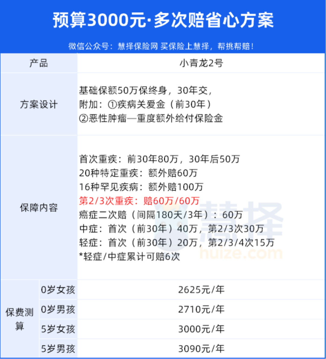 預(yù)算充足的話,小馬老師建議直接一步到位,選擇保終身+多次賠+保障全面得產(chǎn)品→小青龍2號。