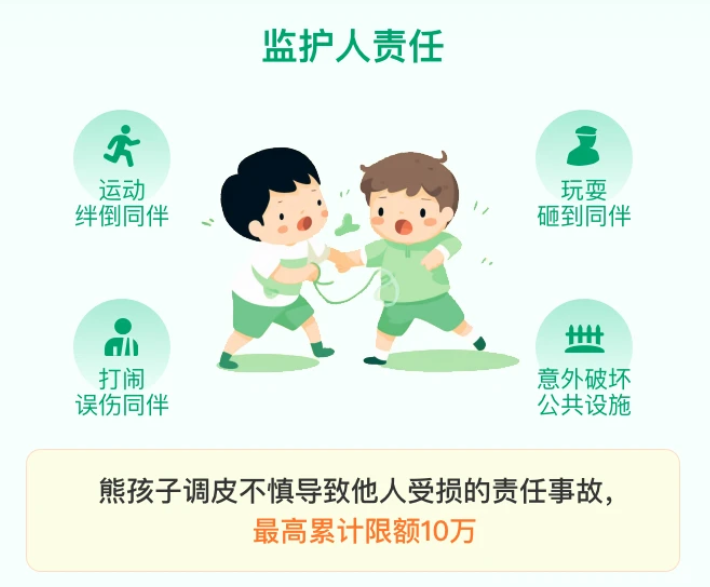 孩子年紀(jì)小,平常追逐打鬧起來可能不止自己受傷,還會誤傷小伙伴,這時候監(jiān)護(hù)人責(zé)任險就派上用場了,不管是誤傷伙伴的醫(yī)藥費,還是第三者的財物損失,都能賠,最高累計10萬元。
