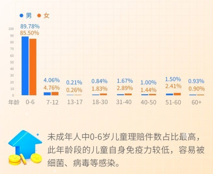 從過去的理賠數(shù)據(jù)來看,以發(fā)燒、肺炎、腸胃炎、腺樣體手術(shù)等情況出險居多,而這些又是小孩子的常見疾病。