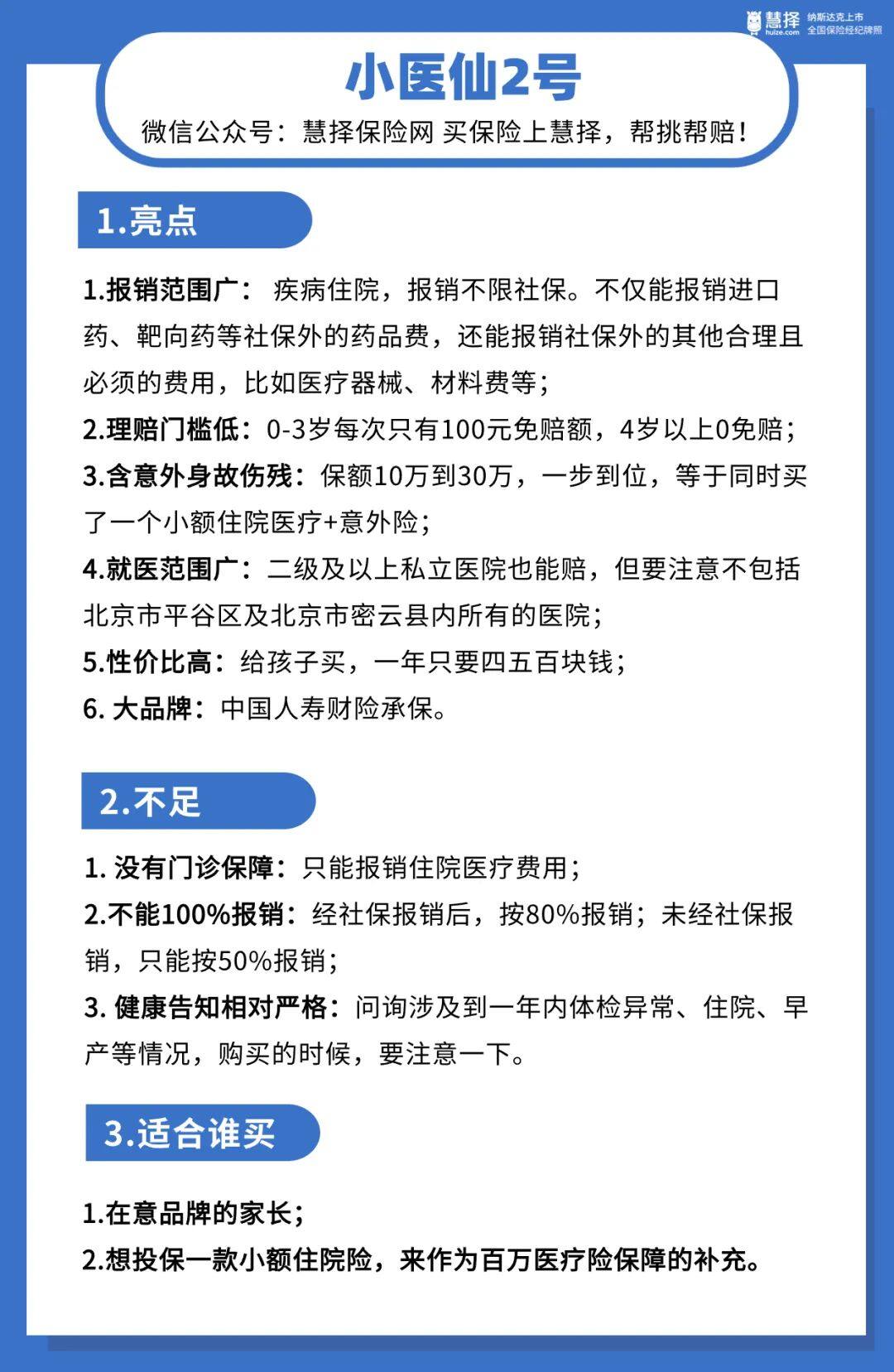 覺得能報銷日常小病的住院治療費用就可以了:選小醫(yī)仙2號,大人小孩中老年人都能買。