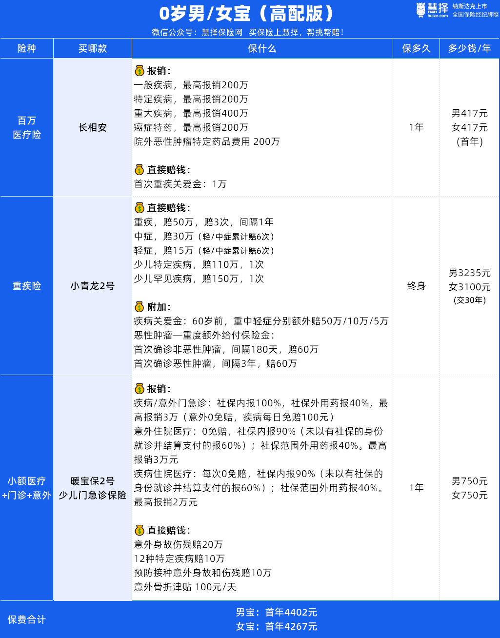 如果預(yù)算更高一些,長(zhǎng)相安和暖寶保2號(hào)也可以考慮替換成含門診的中端或者高端醫(yī)療險(xiǎn),這里就不細(xì)說(shuō)了,如果有方案規(guī)劃需求,可以預(yù)約慧擇保險(xiǎn)咨詢顧問(wèn)進(jìn)一步了解~