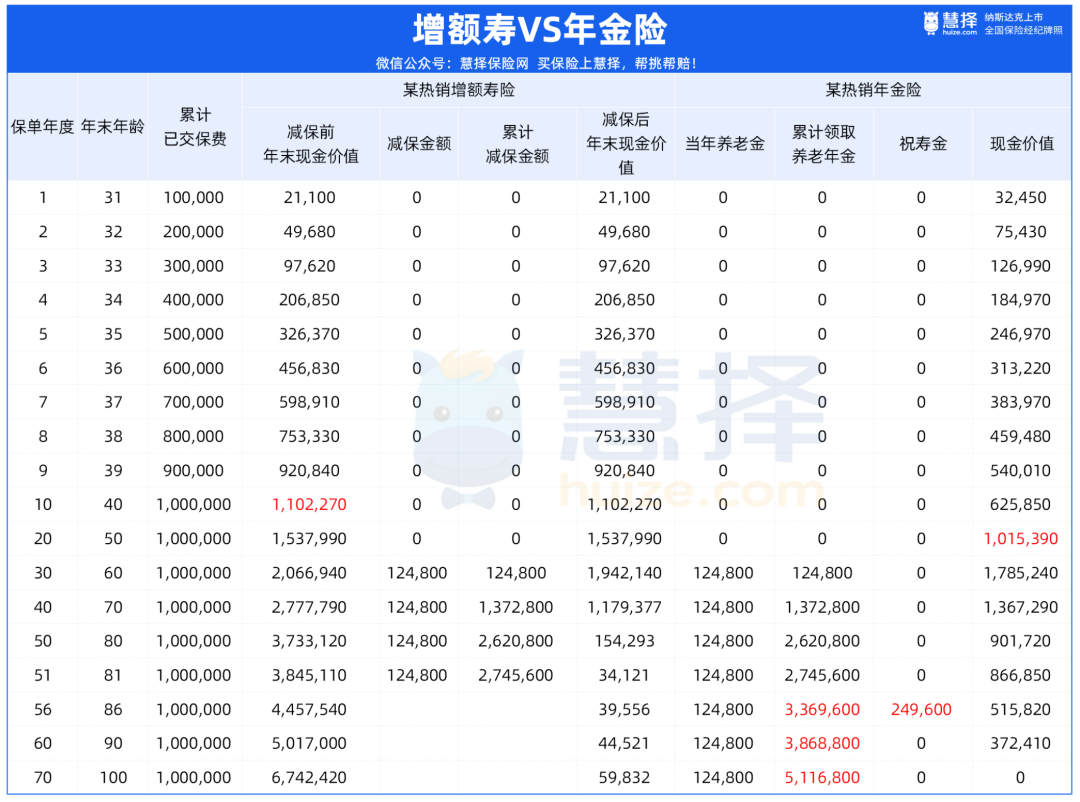 ?前20年,表格所示年金險(xiǎn)的現(xiàn)金價(jià)值增速比較緩慢,直到第20年,現(xiàn)金價(jià)值才超越已交保費(fèi)。