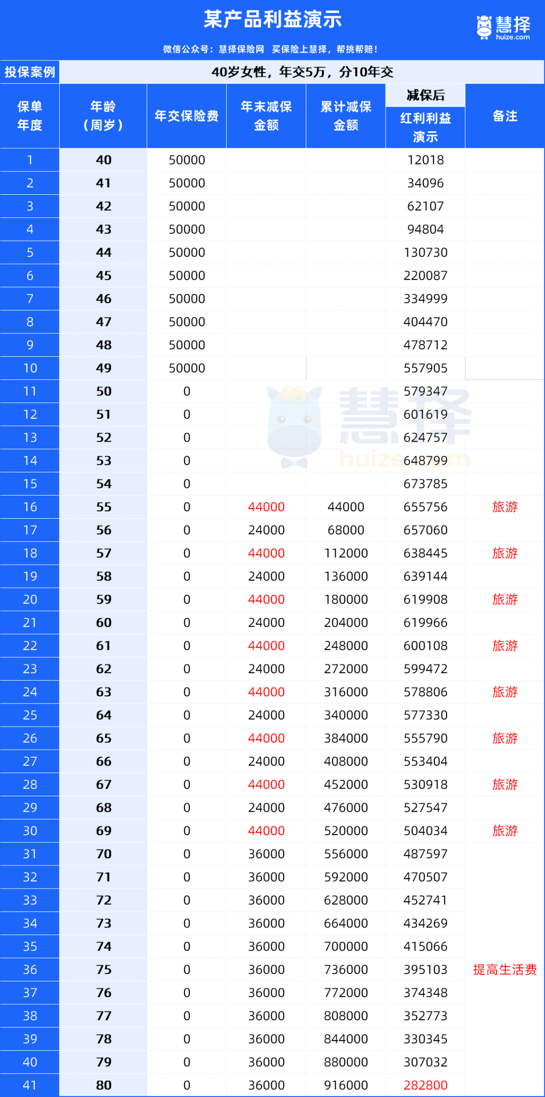 拿一個(gè)產(chǎn)品舉個(gè)例子:某40歲王女士,每年交5萬(wàn),分10年交買這個(gè)產(chǎn)品。