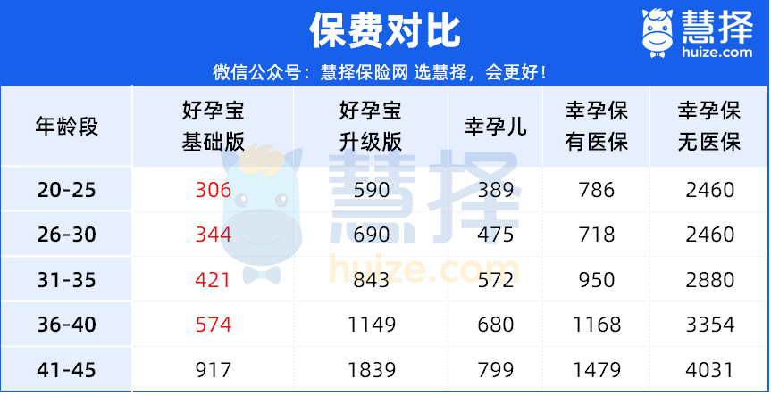 好孕寶基礎(chǔ)版:20-40歲費(fèi)率約為幸孕兒的7-8折,相對更便宜,且自帶豐富的增值服務(wù)。