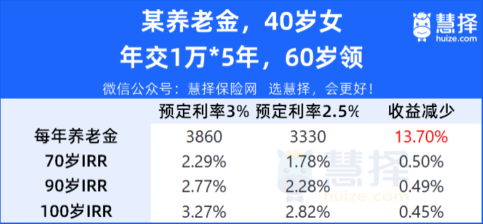 從IRR來看,到100歲,3.0%產(chǎn)品IRR可達3.27%;2.5%的話,IRR只有2.82%。