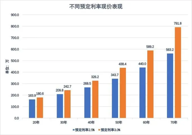 保單20年,預(yù)定利率3.0%增值到180.6萬,2.5%只有163.9萬,差距16.7萬;