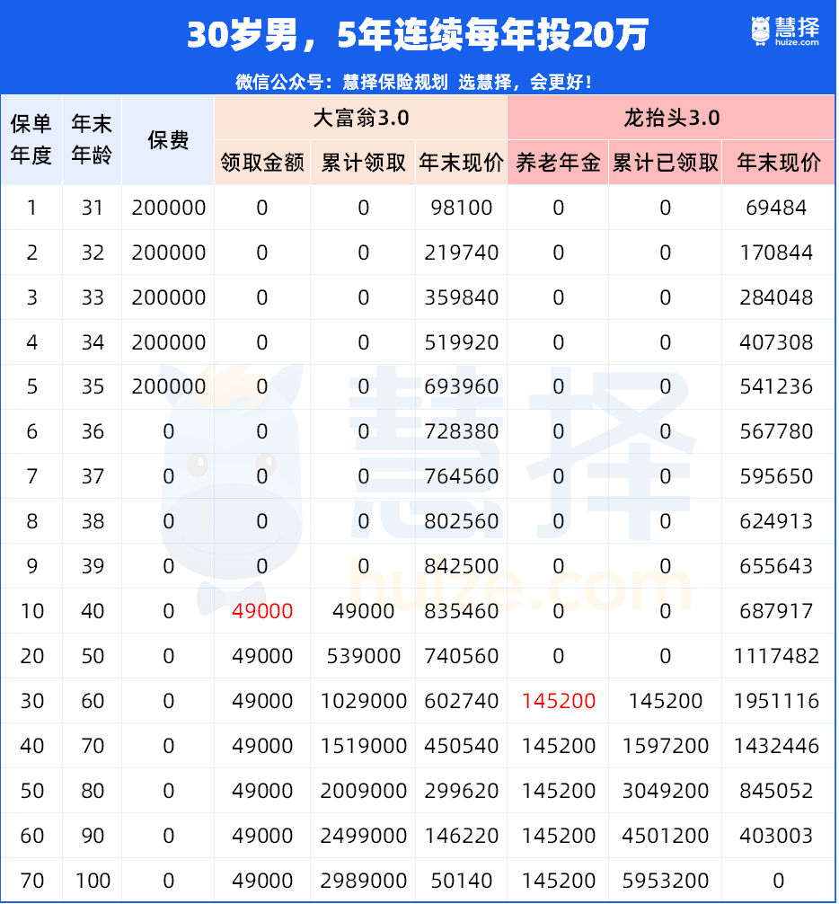 以30歲男性每年投20萬大富翁3.0/龍?zhí)ь^3.0,連續(xù)投5年,40歲開始領取為例