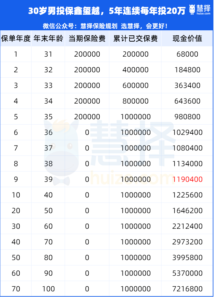可以看到,第9年,現(xiàn)金價值就有119.04萬,比已交保費多19.04萬元