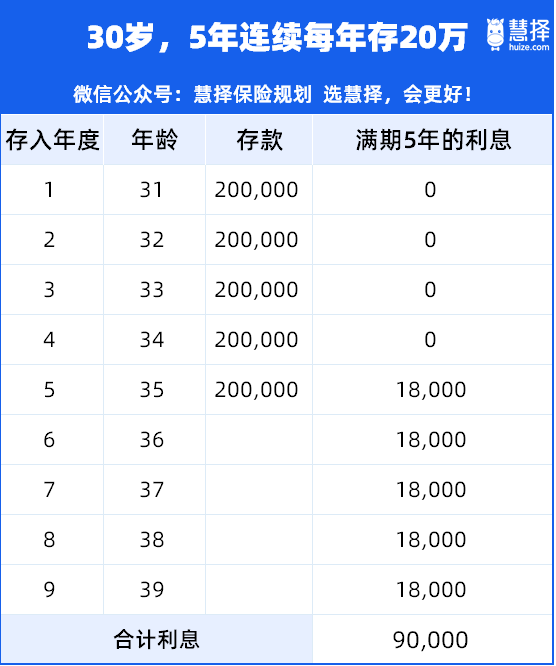 我們以30歲男性,5年連續(xù)每年存20萬,累計存100萬,5年期利率為例