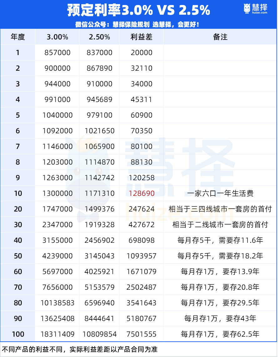 具體差多少?我們某款預定利率3.%爆款增額壽和2.5%的產品做測算對比: