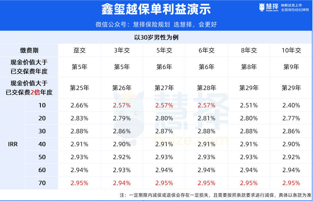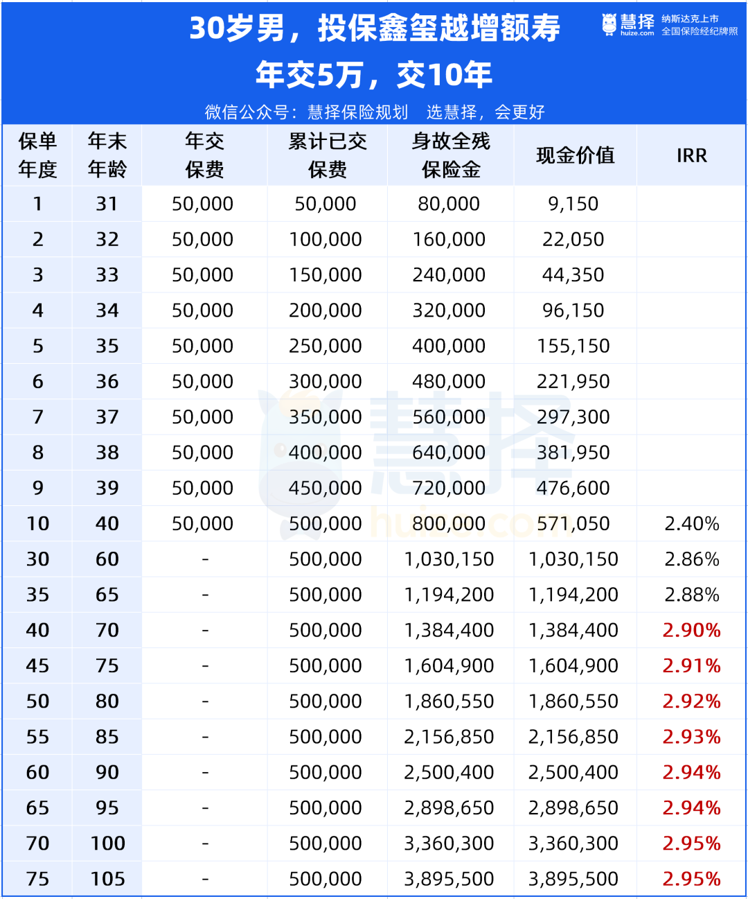 若是用不到這筆錢,保單持續(xù)增值,到后期IRR可以達(dá)到2.95%。