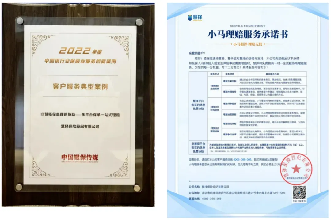 慧擇保險經(jīng)紀公司和小馬理賠,從選產(chǎn)品到理賠,提供全程"一條龍服務"。