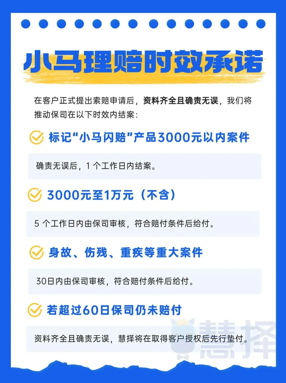 理賠速度也很快,慧擇小馬理賠有一特色服務"小馬閃賠",3000元以內(nèi)的案件,最快1天就能賠。