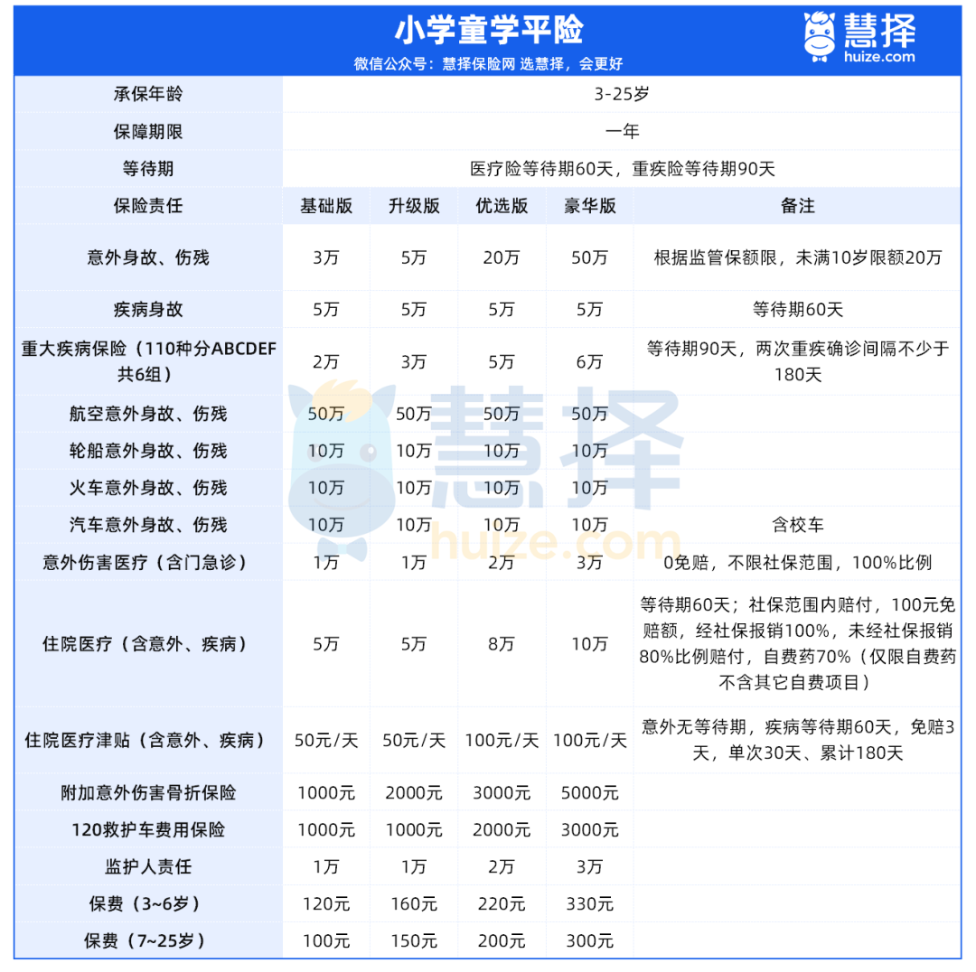 可以看到,小學童學平險的保障,主要分意外、重疾、住院醫(yī)療3部分: