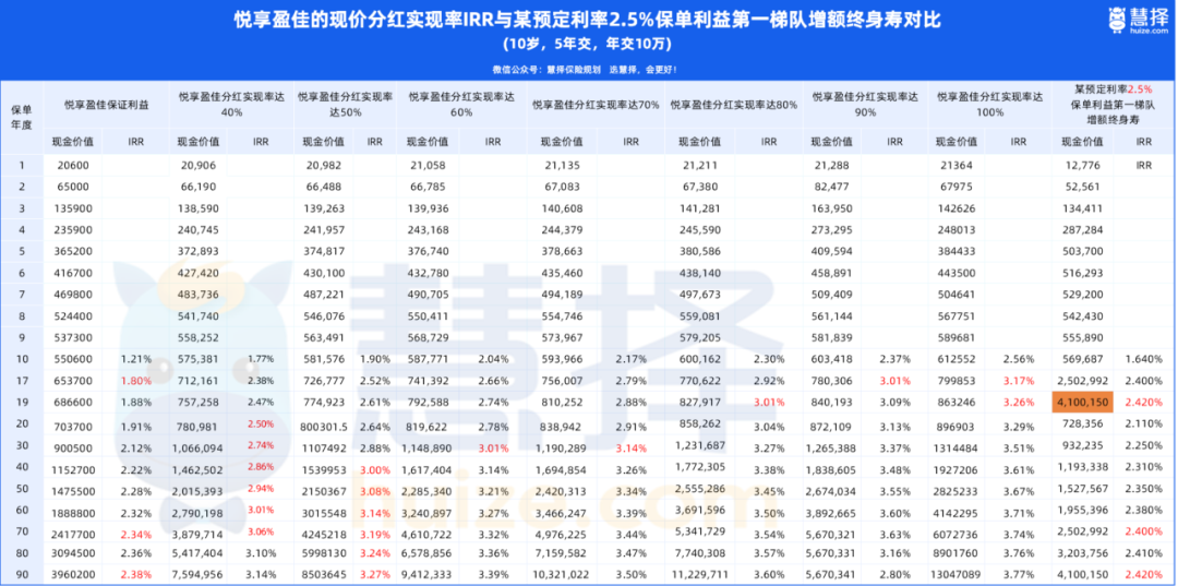 悅享盈佳單看保證利率,IRR最高可以到2.38%,此時(shí)跟預(yù)定利率2.5%普通型增額壽險(xiǎn)的保單利益已經(jīng)旗鼓相當(dāng)。