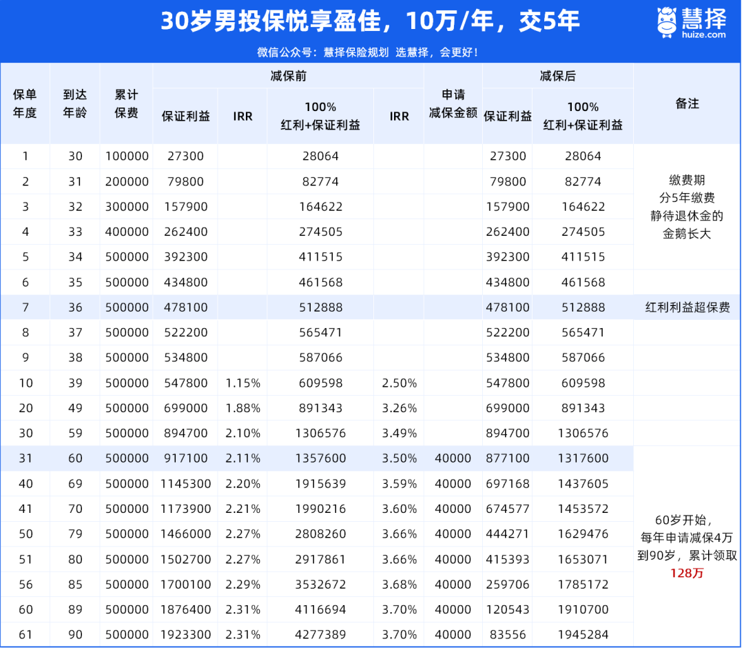 投保悅享盈佳,只需投保50萬,每年交10萬,交5年,60歲開始每年申請(qǐng)減保4萬: