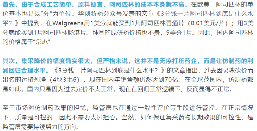 或許是因為外界爭議太大,“中國醫(yī)療保險”為此還專門發(fā)了一篇文章:《3分錢1片阿司匹林,有什么好奇怪的?》