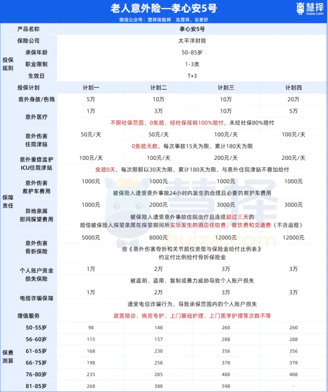 孝心安5號,最高85歲可投,支持1-3類職業(yè)投保,大公司承保,不限社保0免賠,98元/年起,非常適合父母。