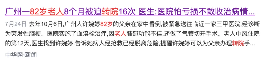 1、住院難:82歲老人被迫轉(zhuǎn)院16次