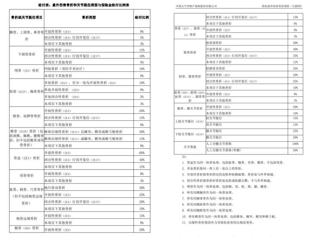 ① 因意外受傷導(dǎo)致的骨折/關(guān)節(jié)脫位,根據(jù)程度按比例賠償(參考下表),最高可以賠償 12000 元;