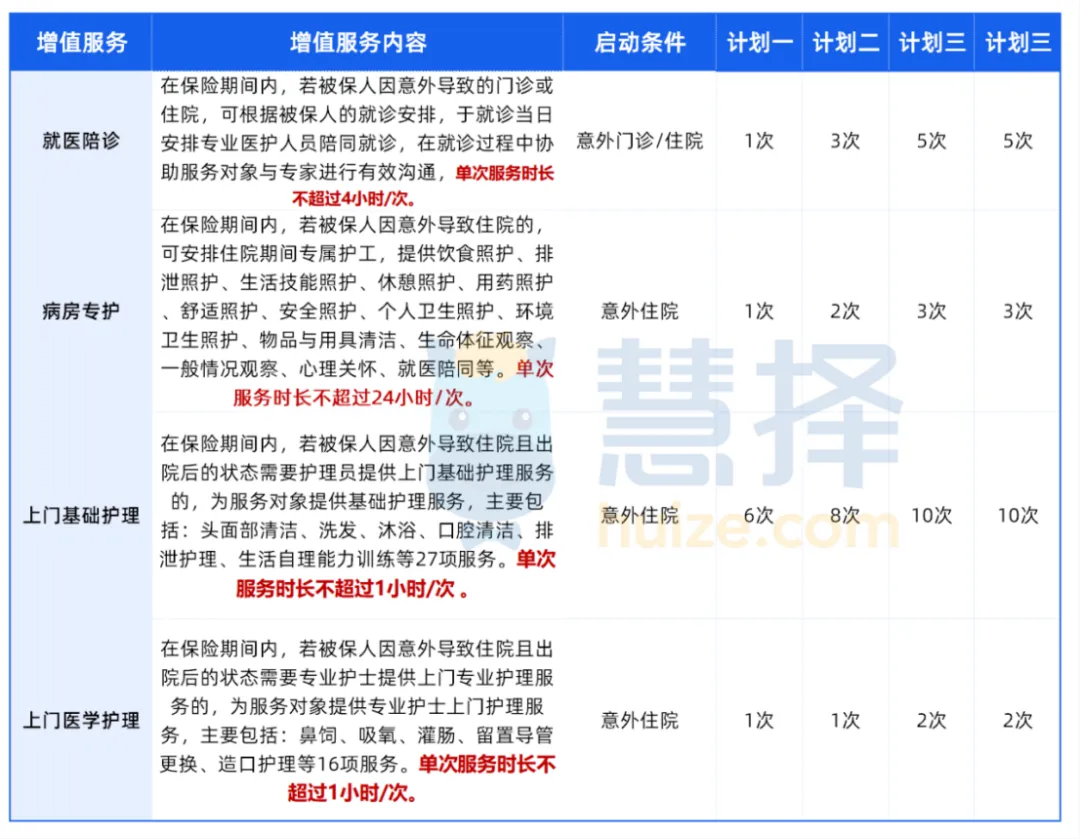 老人發(fā)生意外后,孝心安5號的增值服務(wù),具體包括就醫(yī)陪診、病房專護、上門基礎(chǔ)護理、上門醫(yī)學(xué)護理,省下不少麻煩。