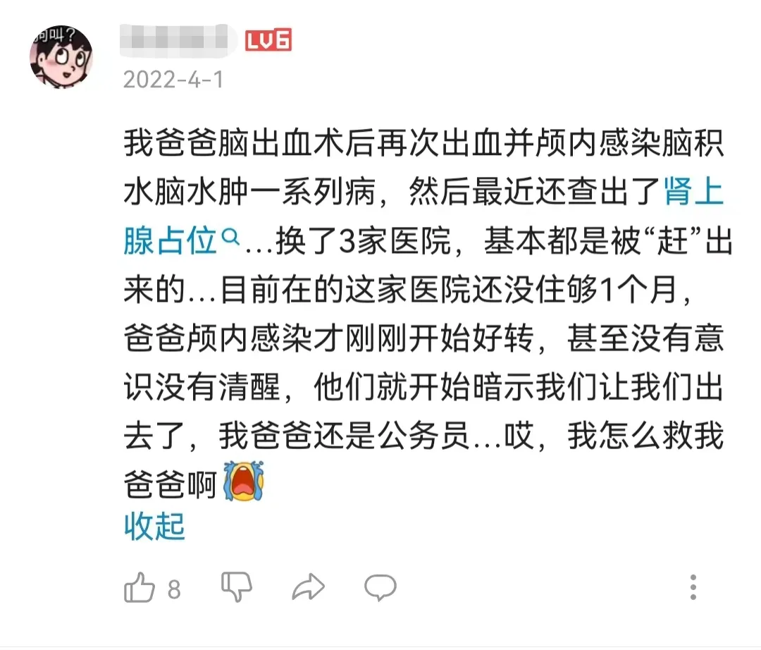 但實際上,老人病情并沒有好轉(zhuǎn),之后,老父親在一個又一個醫(yī)院間輾轉(zhuǎn),每次住院15天左右,就被要求轉(zhuǎn)院。