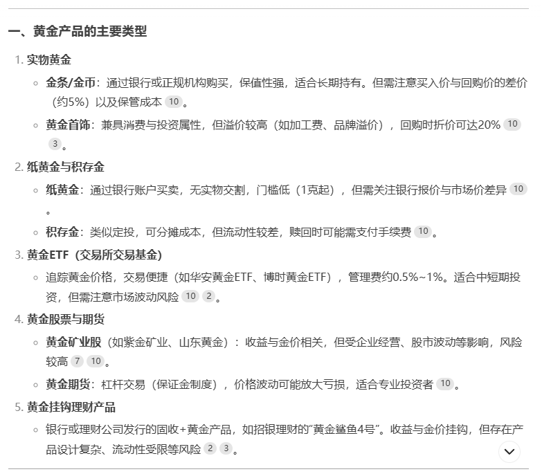 但其實(shí),市面上的黃金產(chǎn)品非常多。DeepSeek給我們總結(jié)了一下: