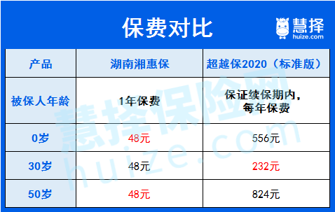 用個挺實惠的百萬醫(yī)療(超越保2020)做對比,老人買湖南湘惠保,還是便宜不少。